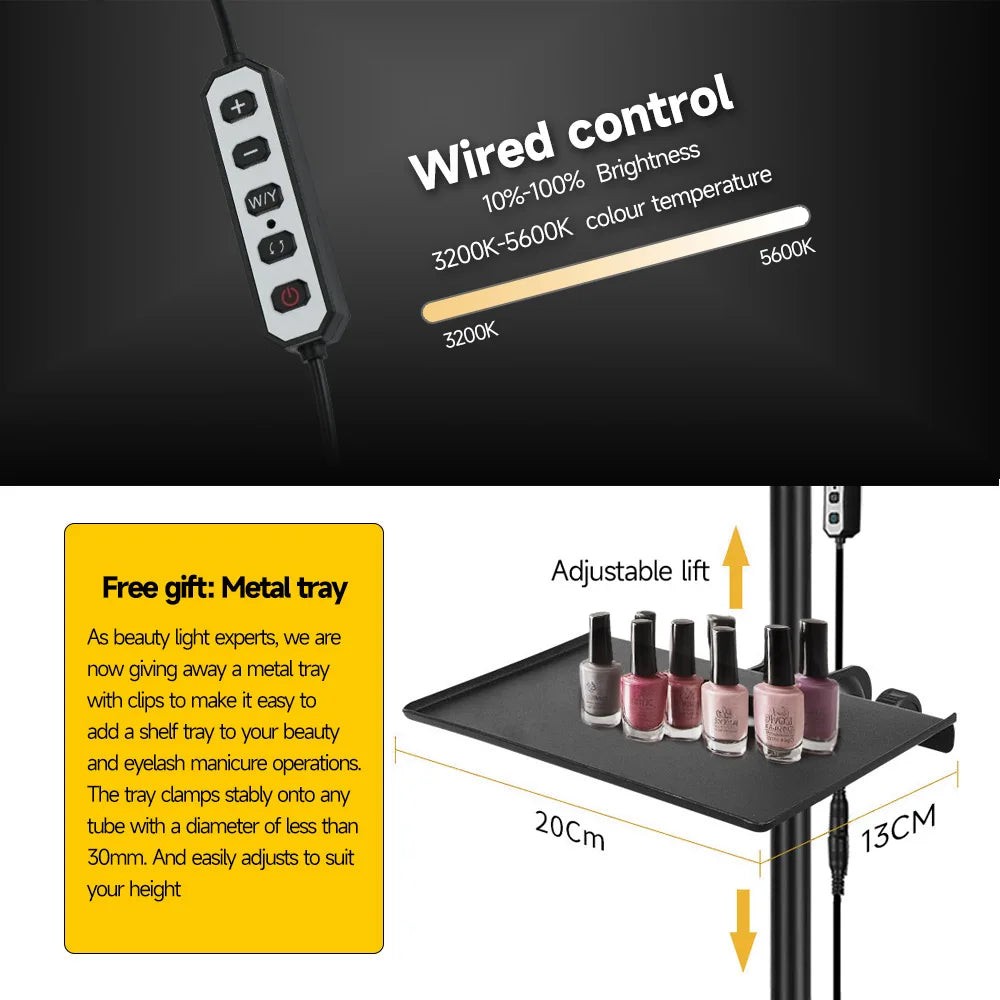 Made of durable aluminum alloy and ABS, this lamp includes convenient accessories like a clamp-on tray, phone holder, and power adapter. Available in stylish colors—black, white, pink, and gold—and customizable with your own logo, it's ideal for lash techs, estheticians, nail artists, tattoo studios, and home beauty setups.