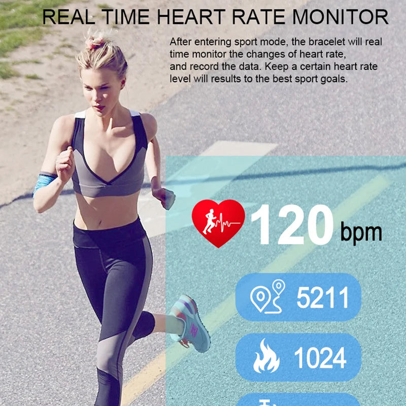 Equipped with a 0.96" OLED color display, the bracelet tracks heart rate, blood oxygen, sleep quality, blood pressure, and daily activity such as steps, calories burned, and distance. Stay updated with call and social media notifications including WhatsApp, Facebook, Instagram, and more—right from your wrist.
